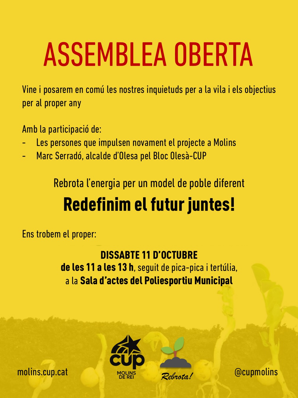 Aquest dissabte a les 11h rebrota la CUP a Molins en assemblea oberta!