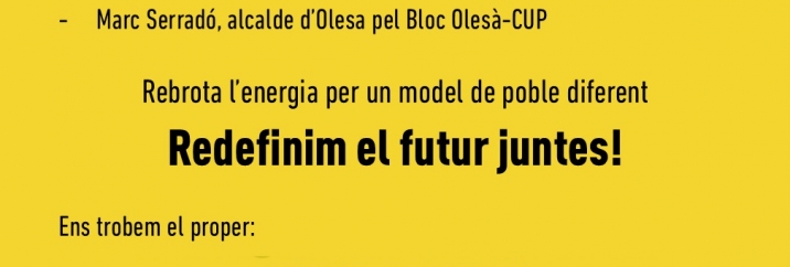 Amb aquest correu, volem especialment convidar-vos a totes les que heu participat, us heu apropat o heu volgut estar al dia de la feina que feia la CUP i ens vau donar el vostre contacte. A l'assemblea oberta debatrem sobre com encarar els temps que ara venen, els problemes del poble o com incidir com a CUP, amb l'especial companyia de Marc Serradó, alcalde per la CUP a Olesa de Montserrat.